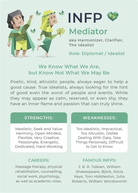 The INFP-T personality test delves into the depths of your psyche, revealing your core values, motivations, and preferences. It unveils your strengths, such as your empathy, creativity, and ability to connect with others. It also highlights areas where you may face challenges, such as difficulty making decisions or expressing your emotions.