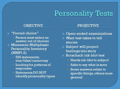 Projective and objective personality tests provide valuable insights into personality, but their unique approaches offer distinct contributions to our understanding of the self. Projective tests delve into unconscious drives, conflicts, and defense mechanisms, offering a glimpse into the hidden dynamics of personality. Objective tests, on the other hand, provide a structured and quantitative assessment of personality traits, offering a more standardized and reliable measure of individual differences.